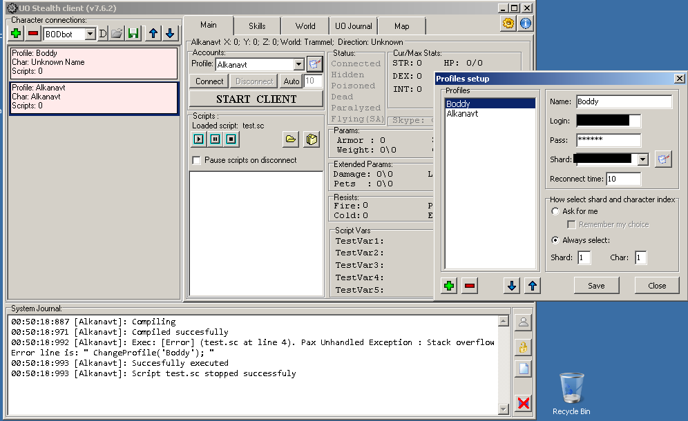 Все персонажи отключены. В окне 2 перса из одного аккаунта. 1-й по списку профайл называется "Boddy". Выделяю второй профайл (Alkanavt), запускаю в нём скрипт: